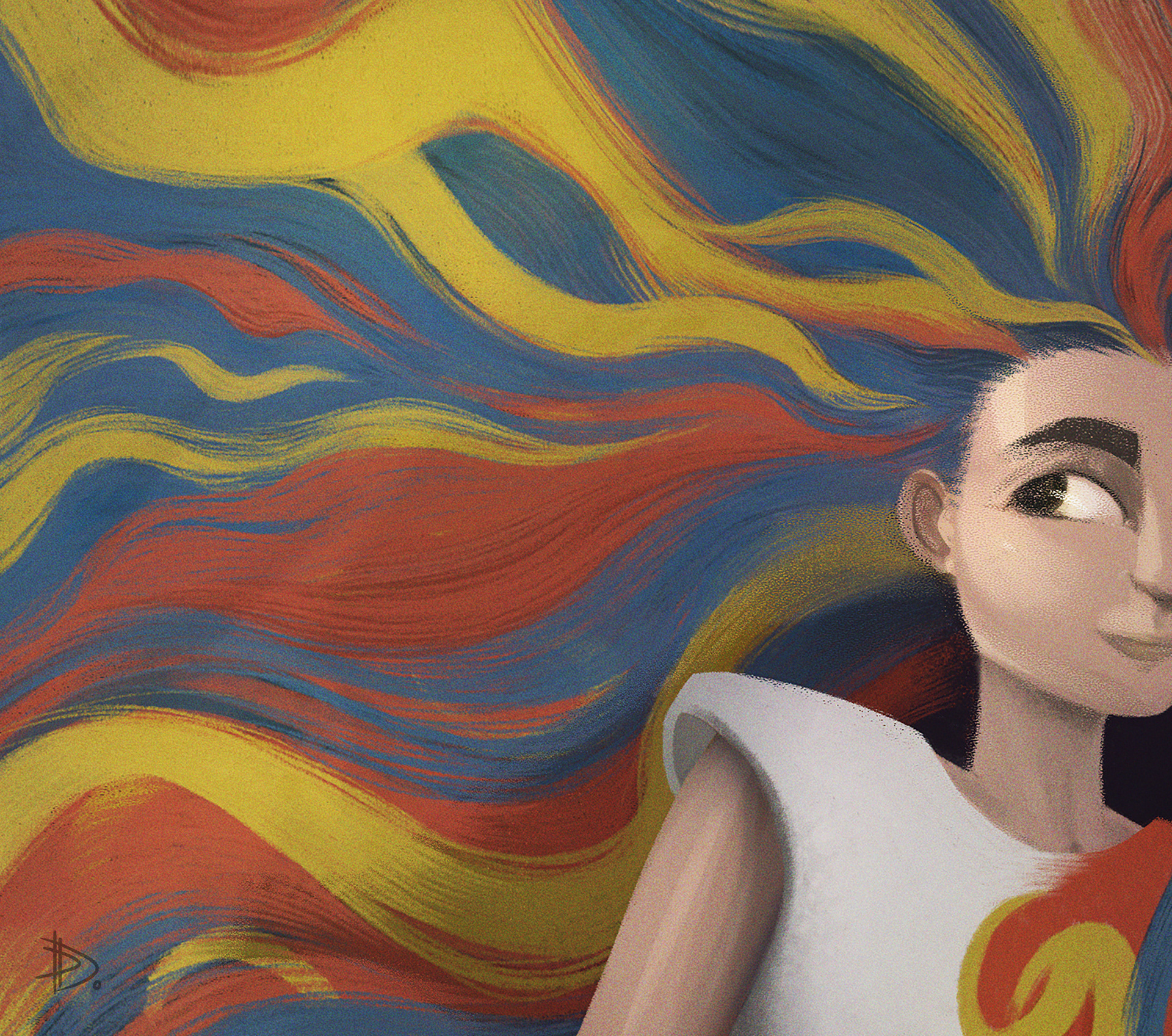 This work was created for an article by Raquel Raimundo on ambiversion for Editorial Drawing course (MFA in Drawing at FBAUL). The idea is about a character who is both introverted and extroverted — with her colorful hair, floral shapes and plain dress, she stands calm through color and colorful through darkness, showing a way with a golden flower.