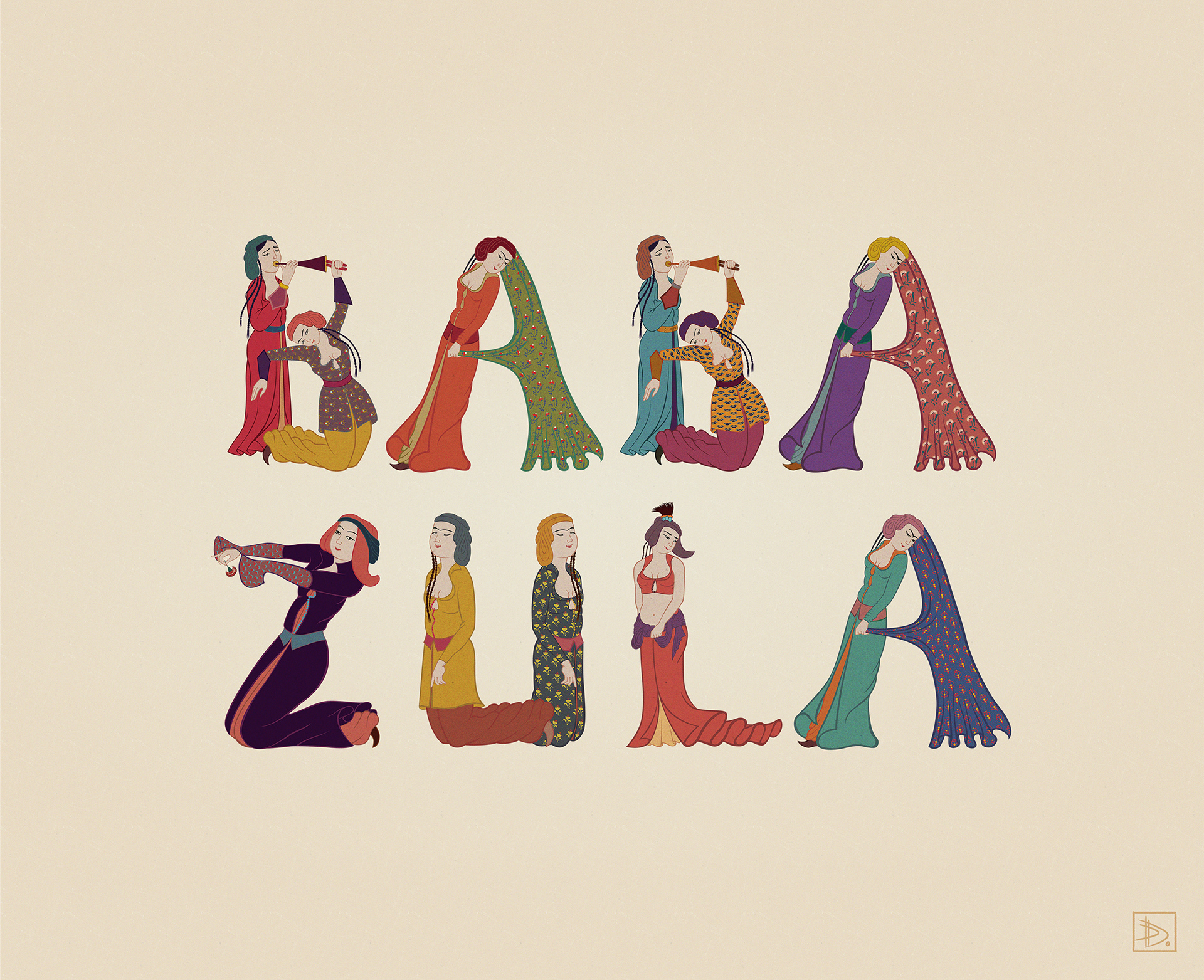 Baba Zula is a Turkish alternative music band known for its unique psychedelic sound, blending traditional Turkish instruments with electronica, reggae, and dub. Inspired by the female figures of Levnî, the most famous miniature artist of the Ottoman era, every letter was hand-illustrated — with sketches offering a glimpse of the process — reflecting the vibrant energy of Baba Zula’s stage performances. This project was created simply for fun and as a way to practice my skills.