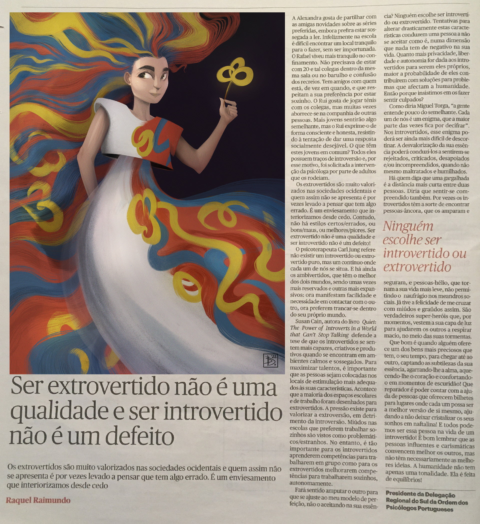 This work was created for an article by Raquel Raimundo on ambiversion for Editorial Drawing course (MFA in Drawing at FBAUL). The idea is about a character who is both introverted and extroverted — with her colorful hair, floral shapes and plain dress, she stands calm through color and colorful through darkness, showing a way with a golden flower.